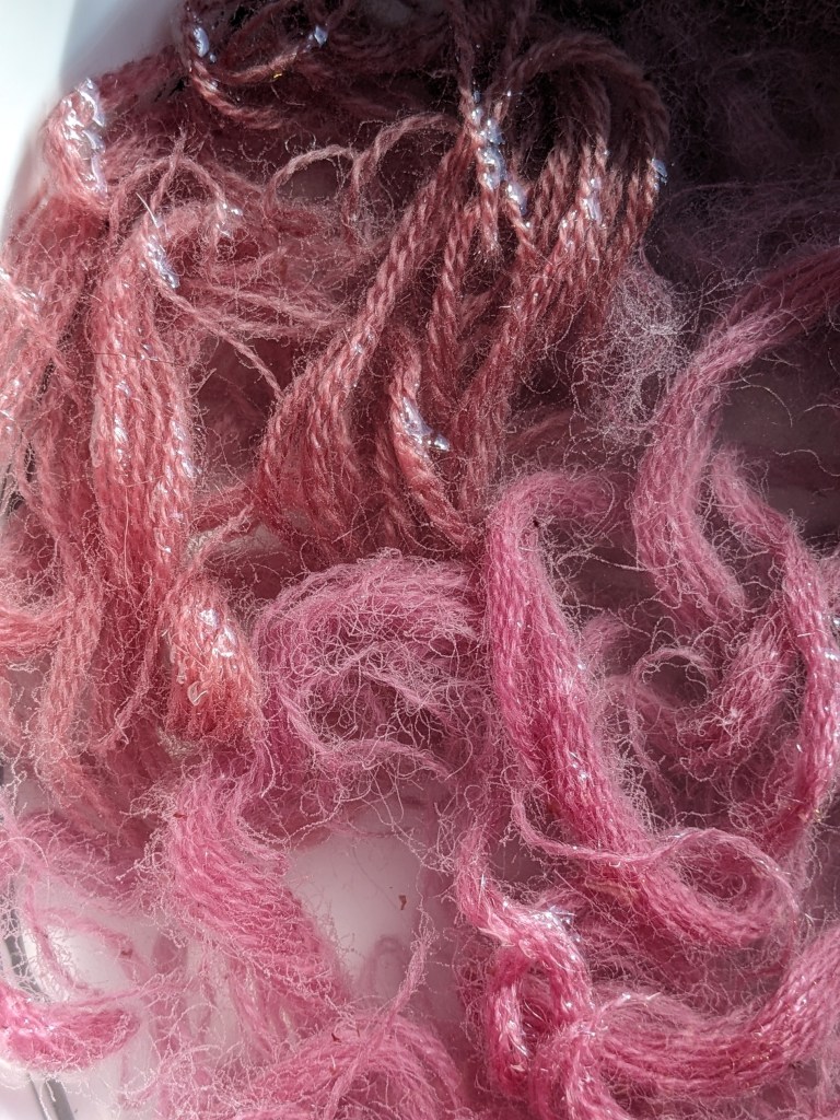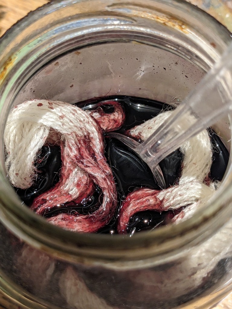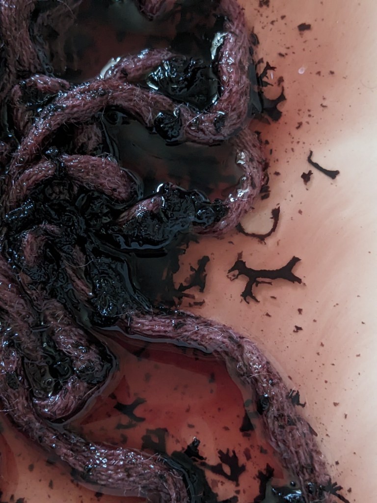 a highly personal orcein-derived ammonia method dye from oakmoss, evernia prunastri. cautiously foraged windfall lichens from Addington Hills, very near my childhood home, to make this precious fleeting dye.